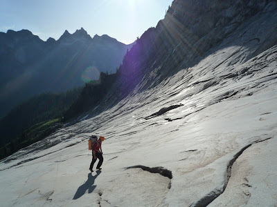 Dylan on the polished granite slabs of the Pocket Glacier cirque: