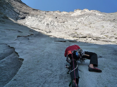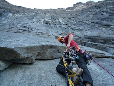 Realizing we were off route for sure, we rappelled back down to the bivy terrace, and decided it was time to bail (although on our way down we found where the correct route continues, on a much less obvious feature, but on better rock):