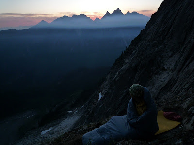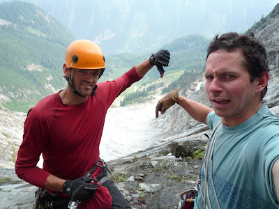 On Wednesday through Friday Dylan Johnson and I made an attempt on Slesse’s East Face route. Established in July 1997 by Sean Easton and Dave Edgar, the East Face of Slesse is most likely the hardest route in the Cascades, and like most of the Cascades hardest routes (pretty much all the rest were established by Pete Doorish), it remains unrepeated, despite several subsequent attempts. The most recent attempt was by Squamish climbers Will Stanhope and Andrew Boyd, who decided after 3.5 pitches that the rock quality wasn’t up to snuff for their free-climbing ambitions. Dylan and I similarly made it only a whopping 7 pitches up the wall. Hat’s off to Sean and Dave for climbing this beast! (And for those who aren’t familiar with it, check out the 2003 AAJ for another Sean Easton route, Blood from the Stone, which, in my opinion, is the best route ever climbed in Alaska).
